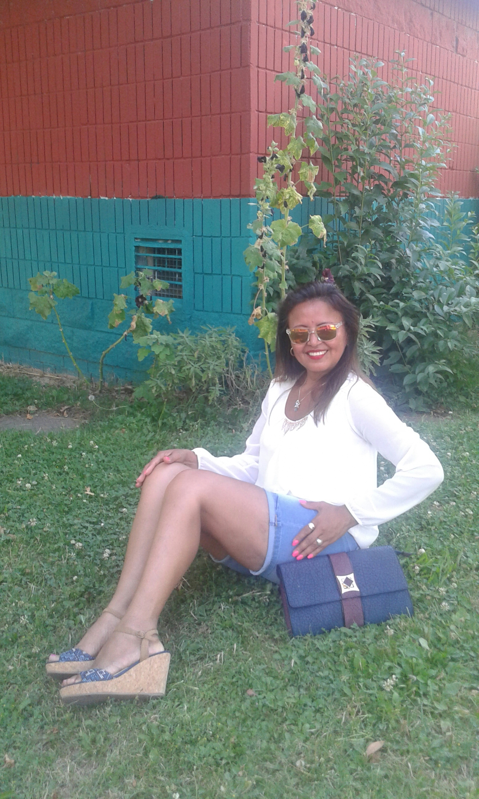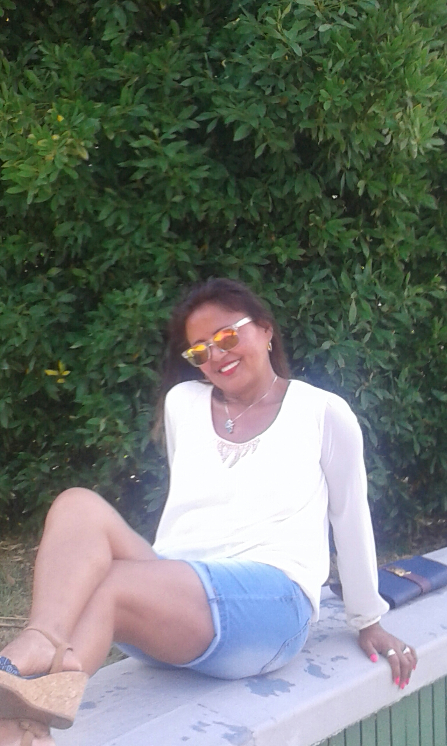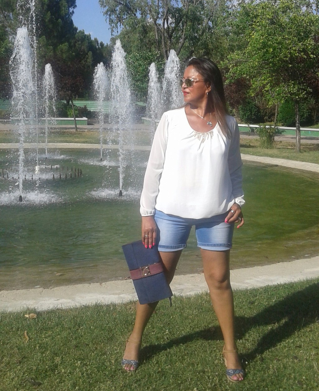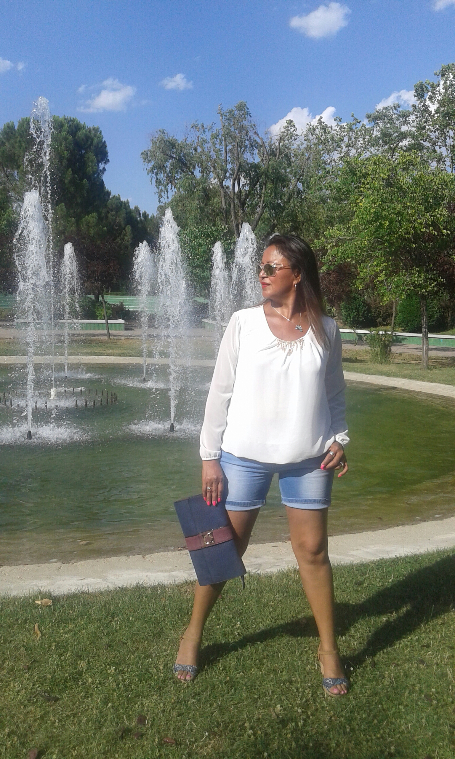 Y en vista del calor elegí un look fresco y cómodo, un pantalón corto (Short), con mis sandalias de cuña, una blusa que a pesar que es manga larga es muy fresquita , y de complemento mi cartera tipo clutch. Y así quedo mi look, que a mí me encanto.