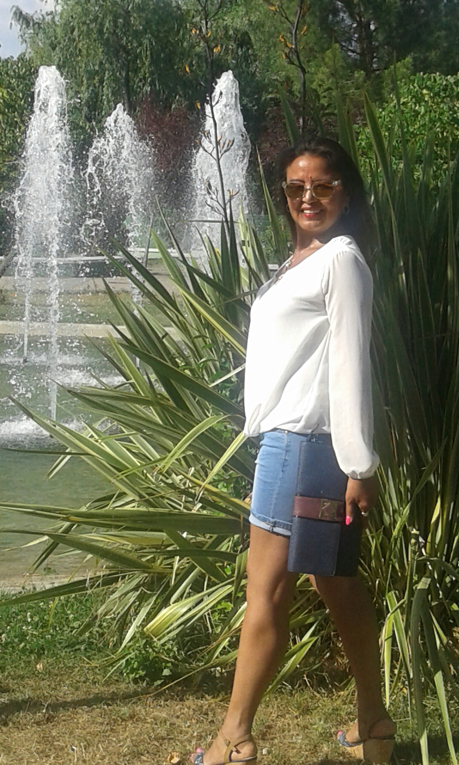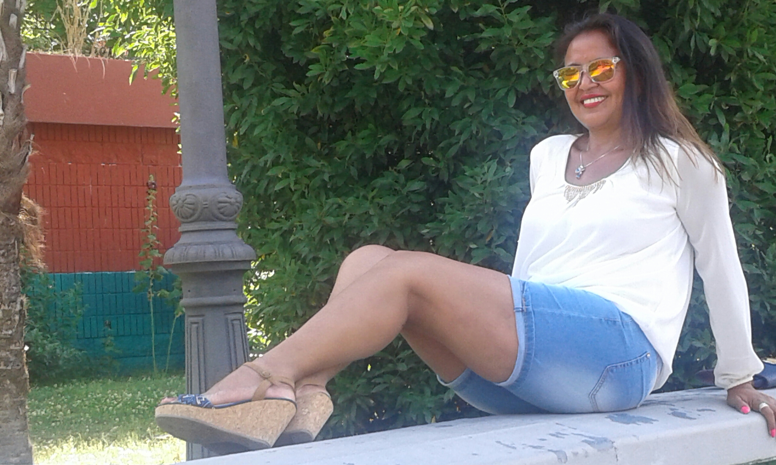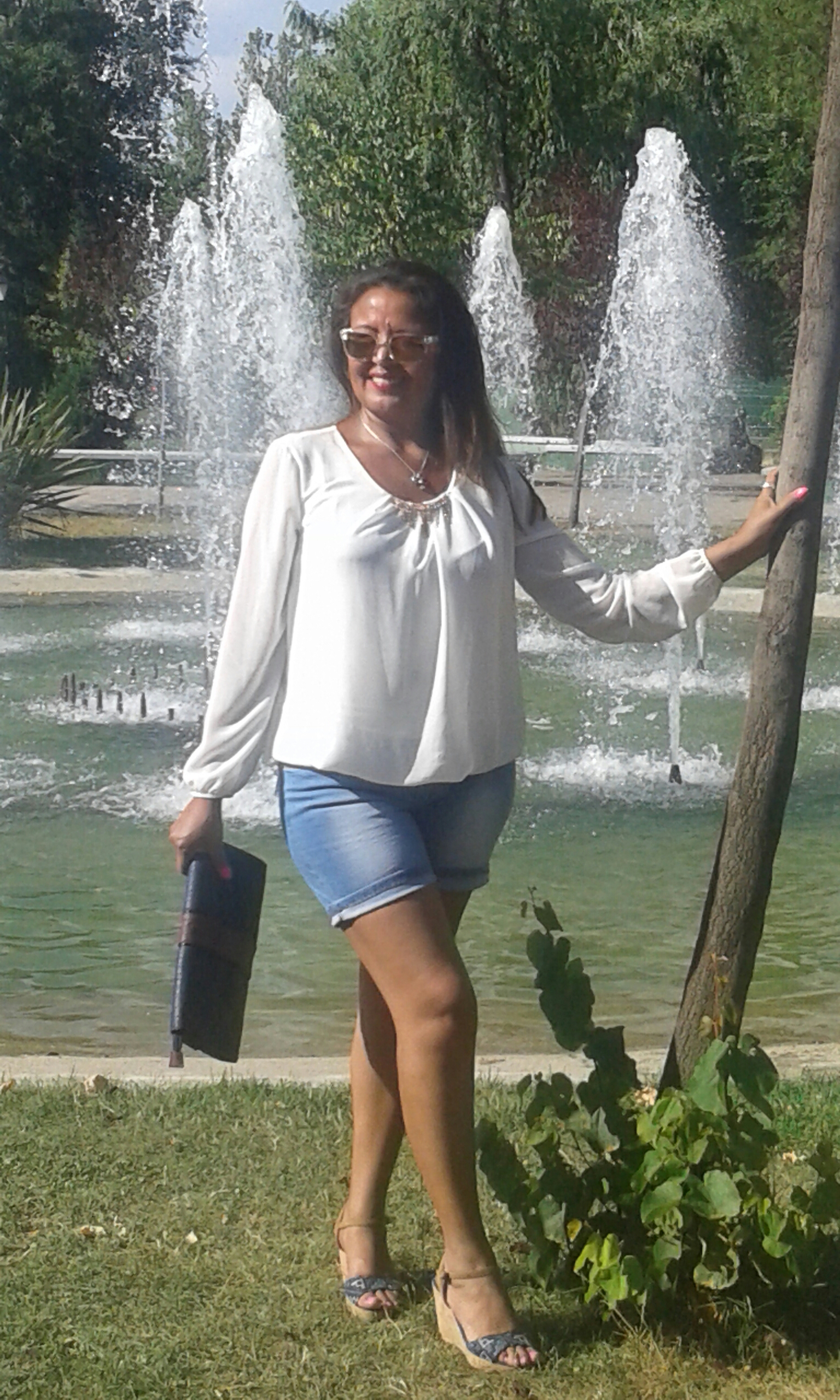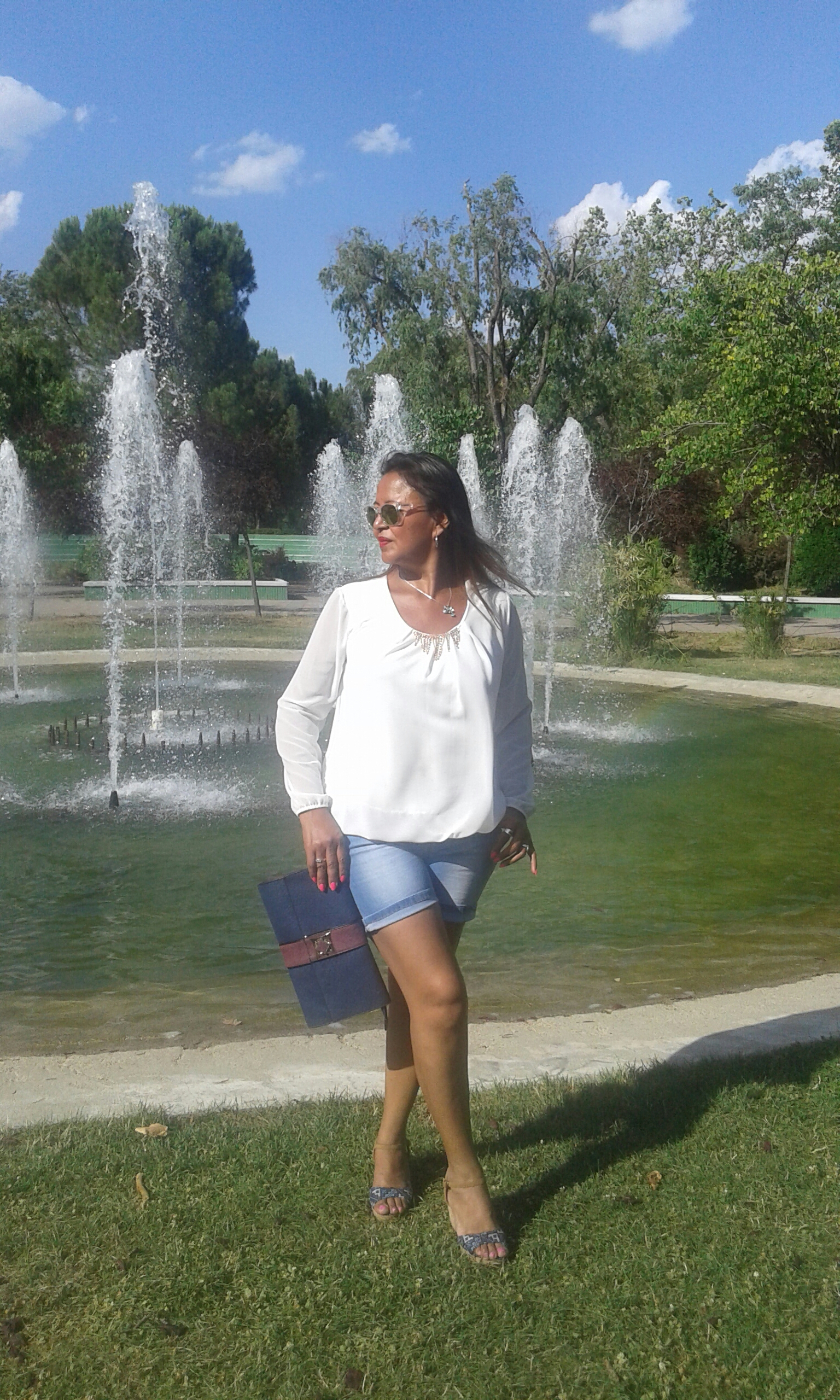 Y en vista del calor elegí un look fresco y cómodo, un pantalón corto (Short), con mis sandalias de cuña, una blusa que a pesar que es manga larga es muy fresquita , y de complemento mi cartera tipo clutch. Y así quedo mi look, que a mí me encanto.