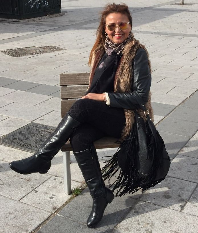 Vaquero, guantes y bolsa negros, botas cebra de goma, chaqueta con capucha de pelos que hacen juego con el chaleco, la bufanda rosa para dar un poco de alegría al look.