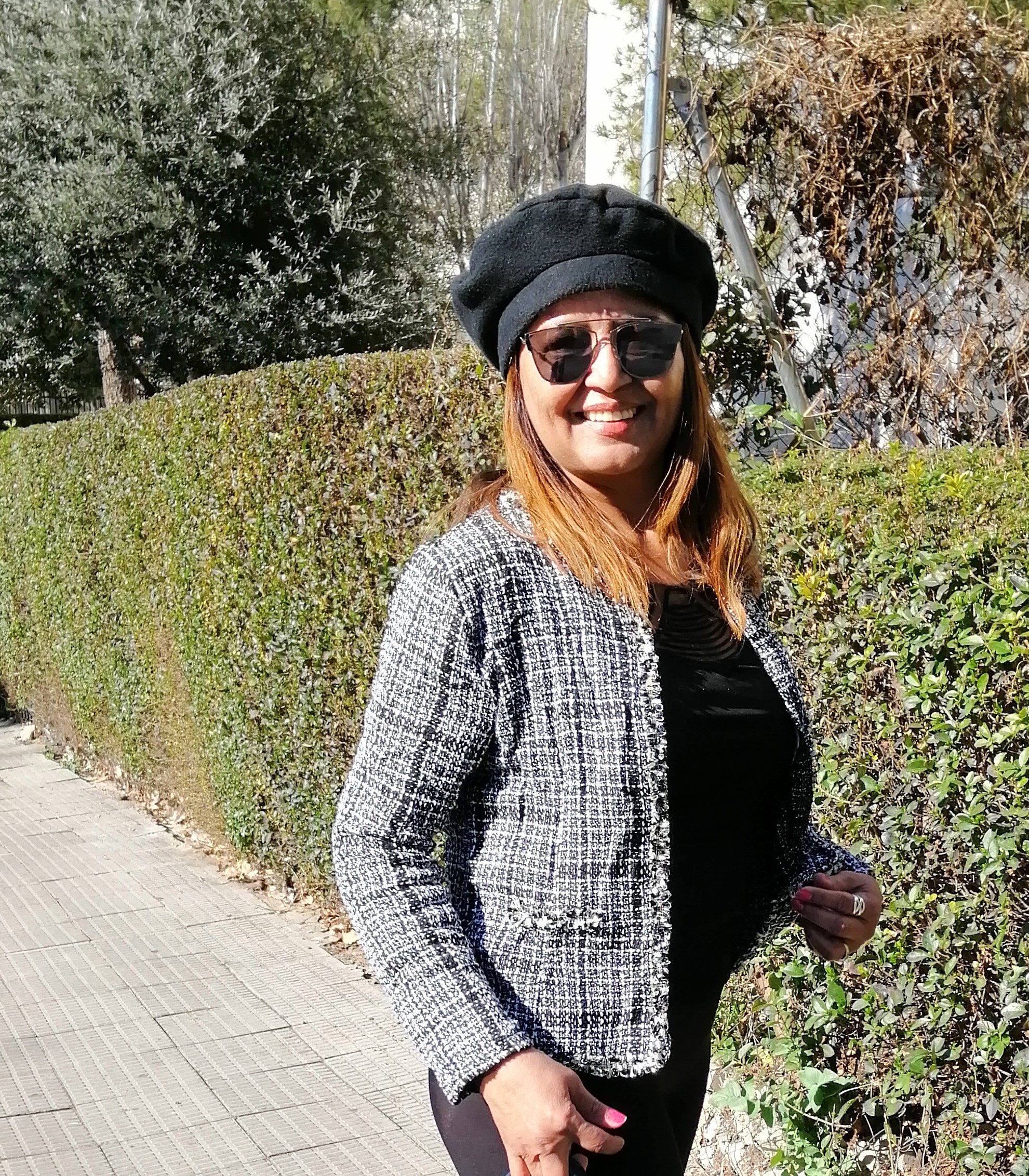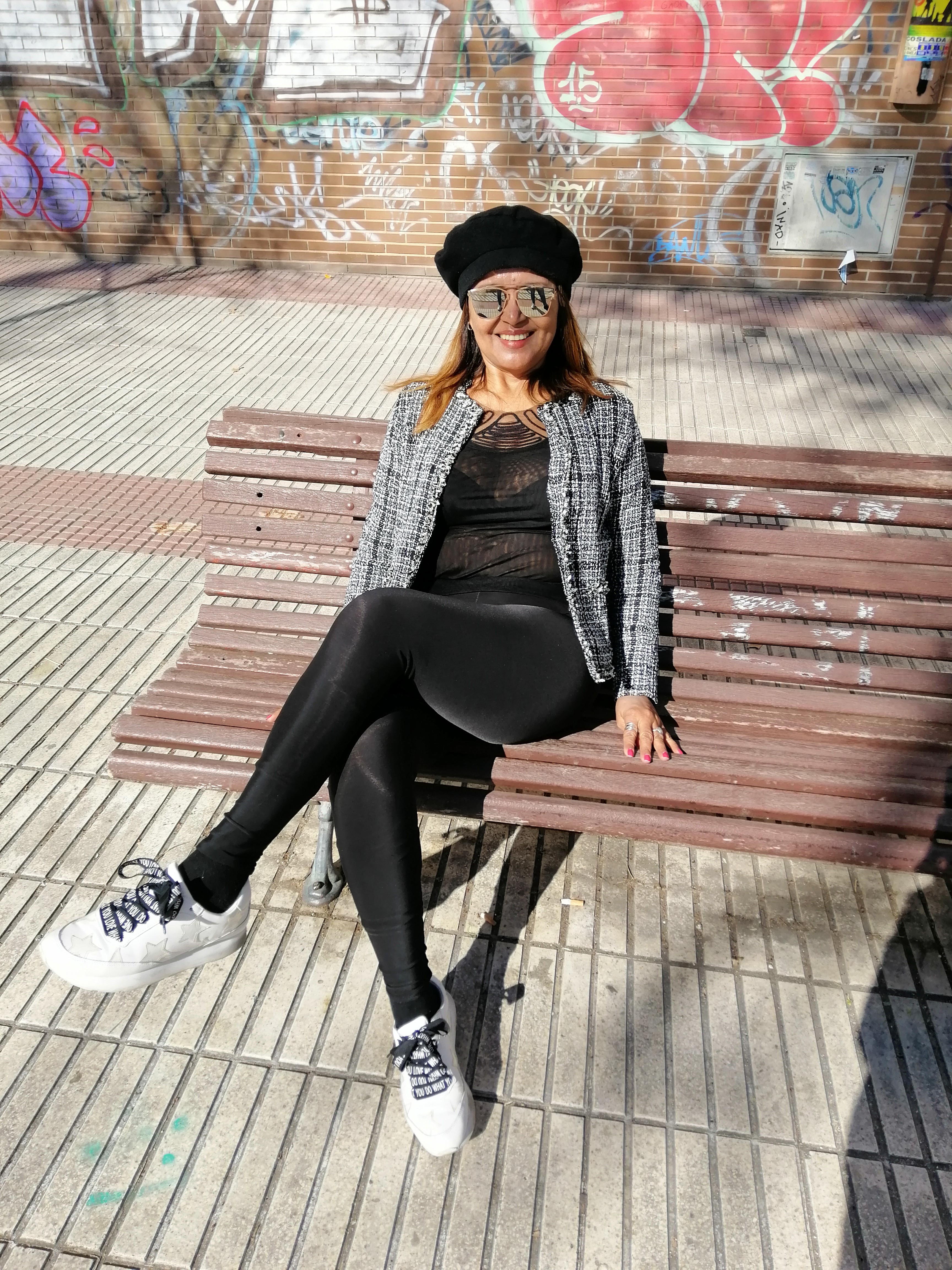 Chaqueta de punto blanca y negra que combine con leggins y camiseta con transparencias de color negro, zapatillas blancas y para darle un toque chic al look de complemento una boina y gafas espejo