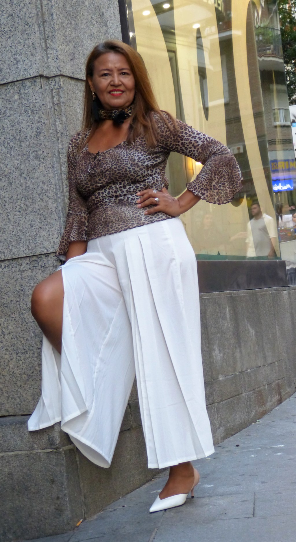 Look con patalón palazzo y top leopardo.