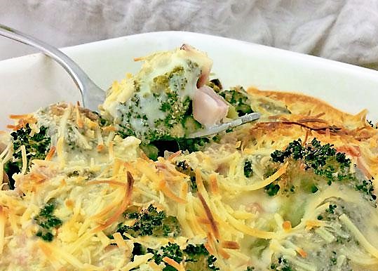 Añadimos la Bechamel repartiendo por igual cubriendo el brócoli, espolvorear el queso rallado calentamos el horno a 200° en función grill y gratinamos 15 min o hasta que el queso dore un poquito sin quemarse. Servir caliente