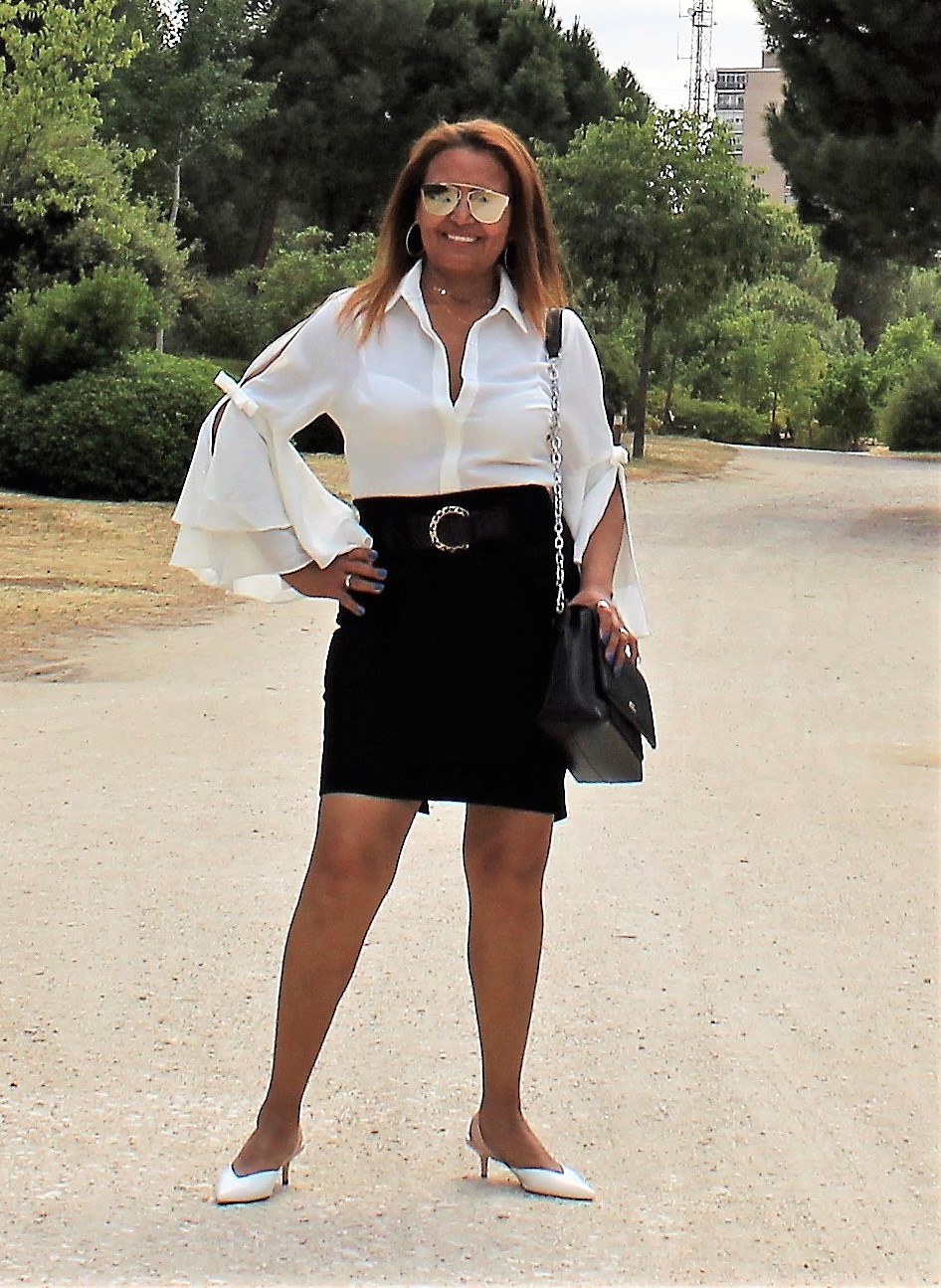 Estas dos propuestas que le muestro hoy son en blanco y negro. En los dos conjunte el calzado con la camisa.