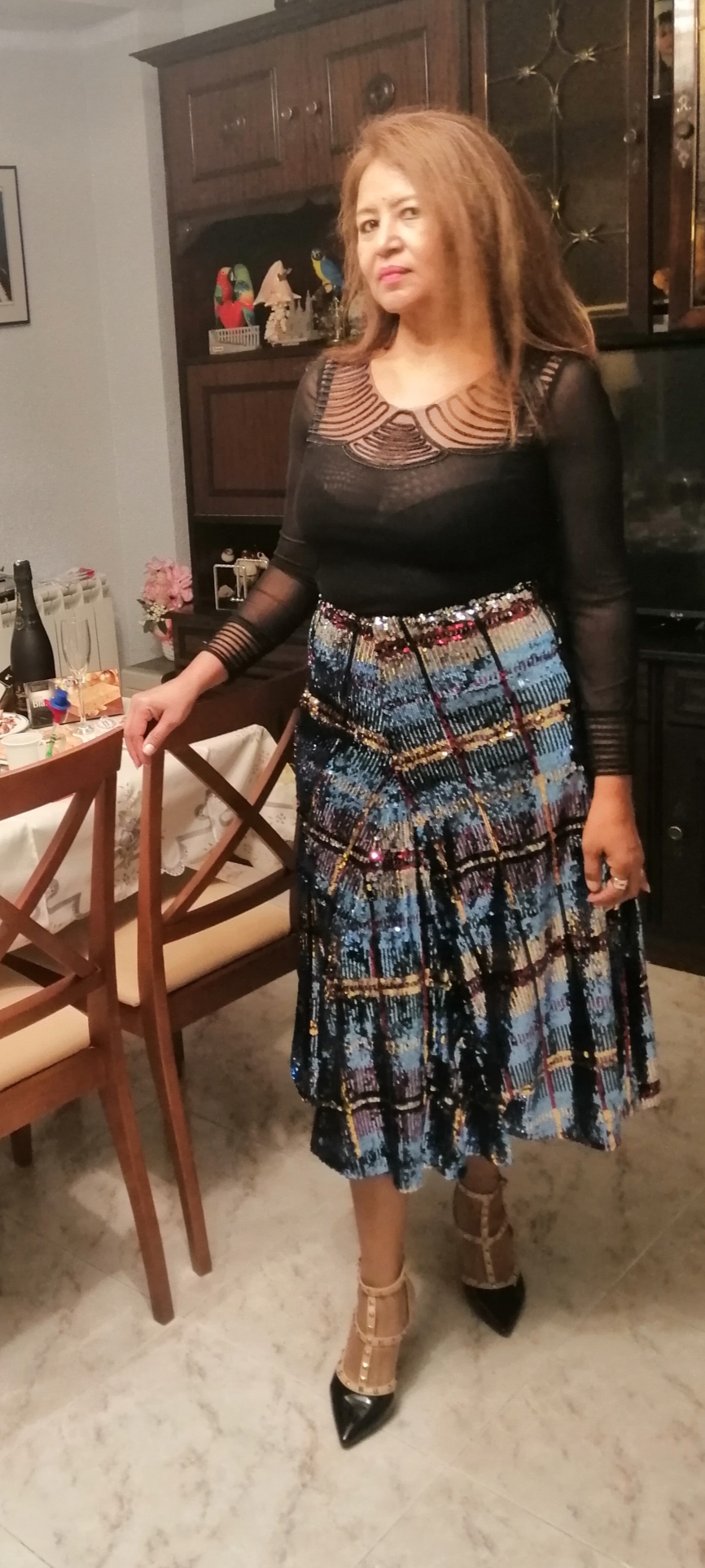 En mi segundo look la protagonista es mi falda de lentejuelas, desde que la vi fue amor a primera vista, es una falda fluida, la largura es hasta debajo de la rodilla, el color predominante es azul, más suaves plateado, rojo, la combine con un top negro manga larga con transparencias, y de calzado unos salones estilo valentino.