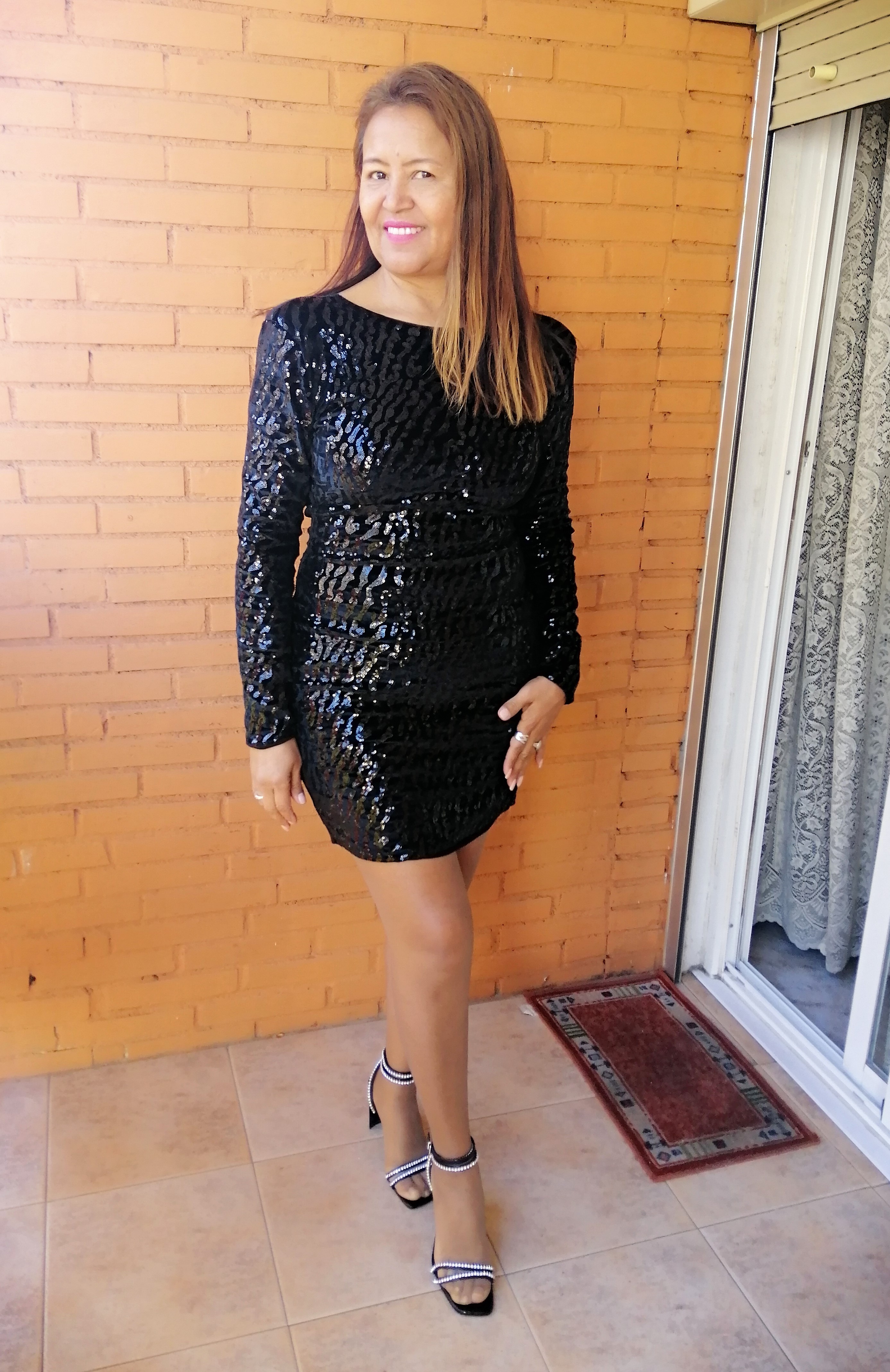 El primer look que os muestro es un vestido negro corto de lentejuelas, manga larga con hombreras. Para darle un toque más delicado use unas sandalias de pulsera, también brillantes. Es look lo use en Noche vieja.