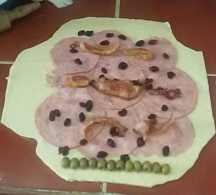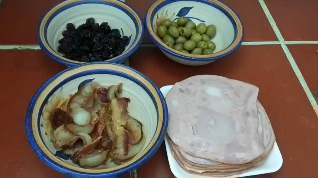 En la orilla de abajo del rectángulo coloca las aceitunas en fila, y a lo largo las lonjas de Jamón, dejando ½ centímetros en los lados, y las 3 tiras de tocineta luego las pasas de acuerdo a tu gusto.