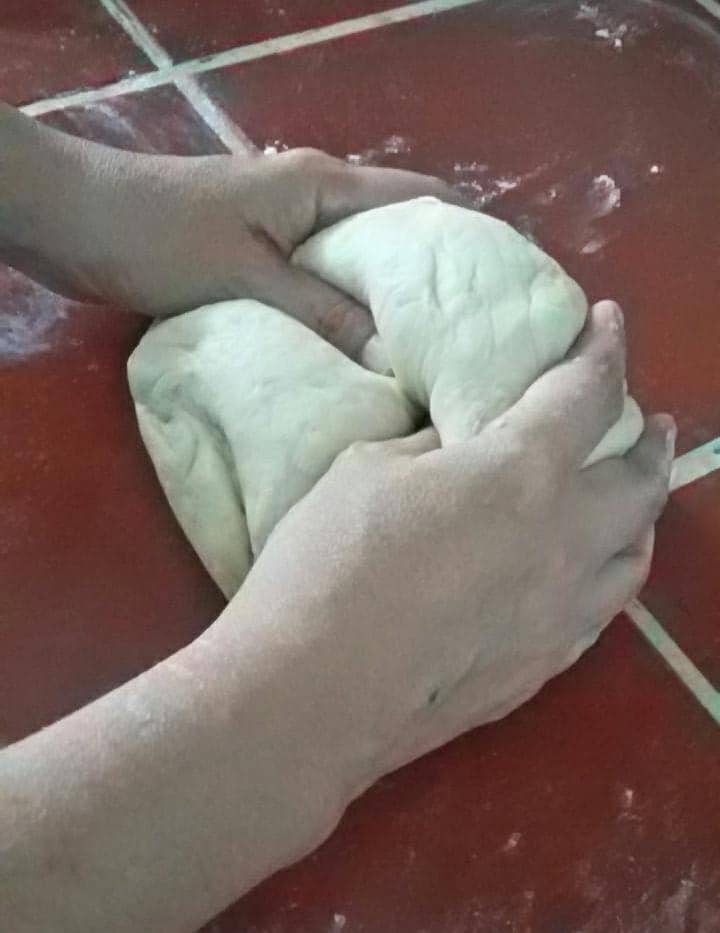 Una vez tengas tu masa lista, la colocas en un mesón enharinado y comienzas a amasar por 20 minutos aproximadamente hasta que ya no se pegue en las manos.