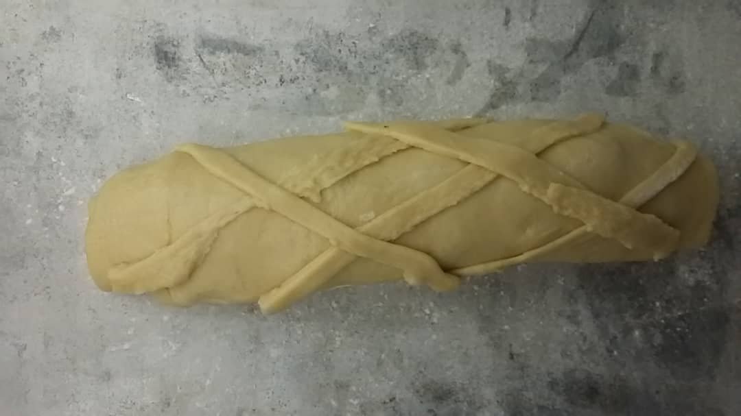 Enrolla tu masa, sellas las puntas mojando tus dedos con agua para que se adhiera. Con las tiras sobrantes decora el pan.