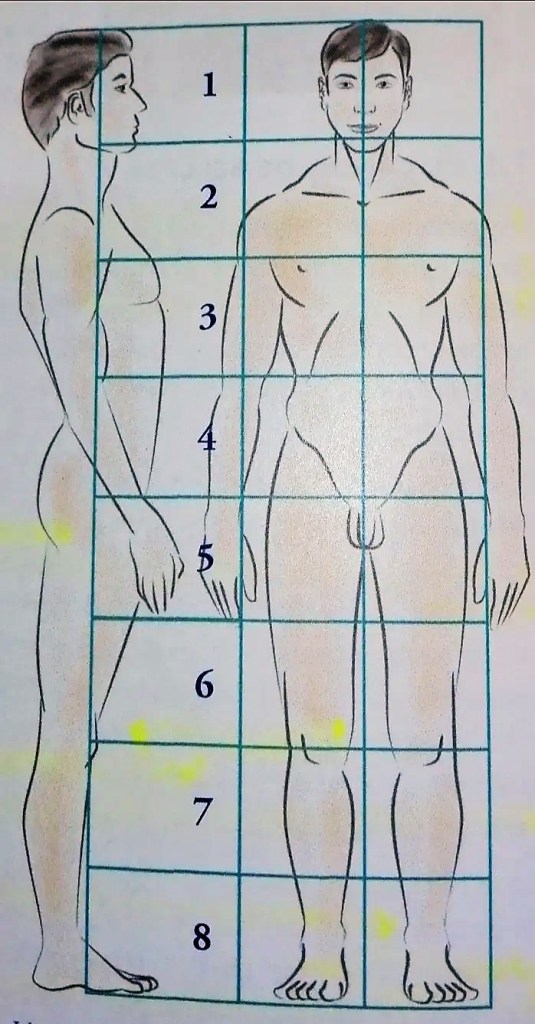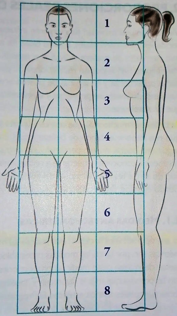 El cuerpo= 8 cabezas de alto y 2 cabezas de ancho (vista de perfil)