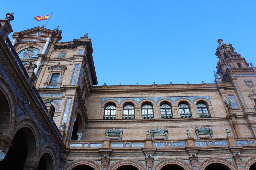 La Plaza de España de Sevilla tiene una configuración semi elíptica, con un edificio que domina el conjunto. Es una construcción inspirada por las villas palladianas con alas curvas. Los extremos de las alas están rematadas con las torres que despuntan por encima de los árboles del parque.