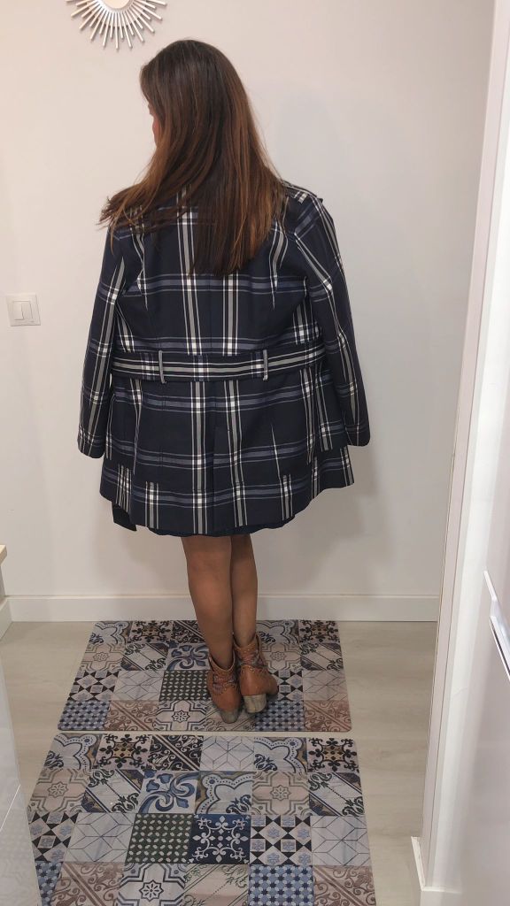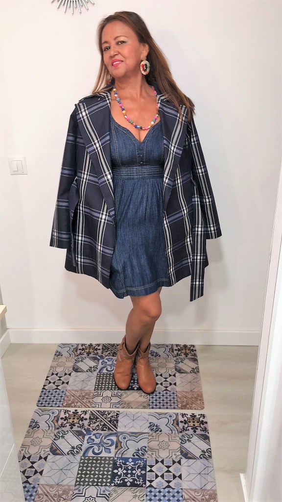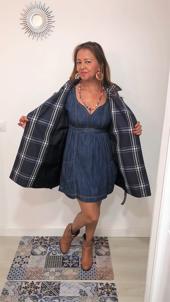 Lo combine con unos botines camel cowboy, y como está es la época de la cebolla porque llevamos ropa a capas, para esos momentos más frescos o lluviosos, llevo una chaqueta impermeable a cuadros color azul a juego con el vestido.