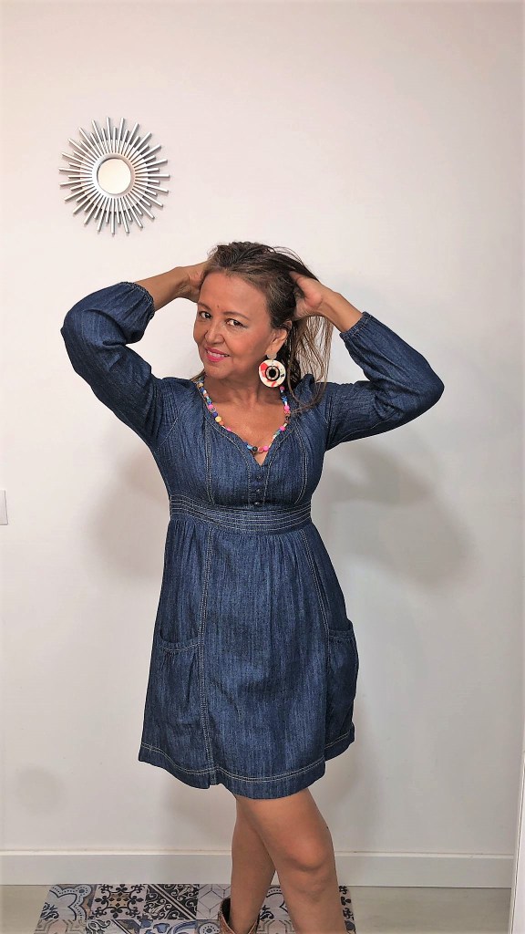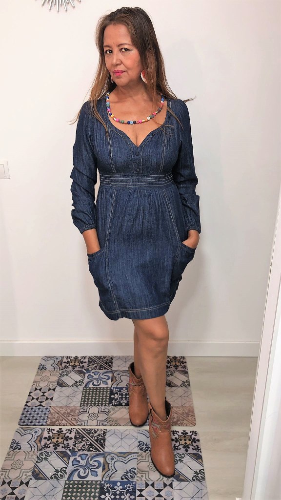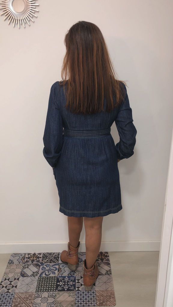 Hoy os traigo una propuesta para este otoño, que espero os gusté. El protagonista es este vestidito denim, manguita larga con goma en los puños, escote corazón, engomado marcando cintura, con bolsillo a cada lado, y la largura ideal (sobre la rodilla).