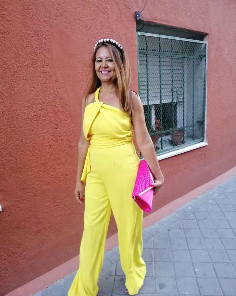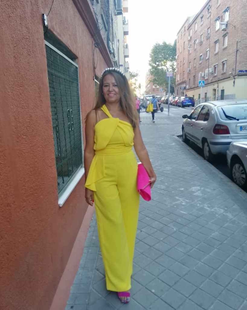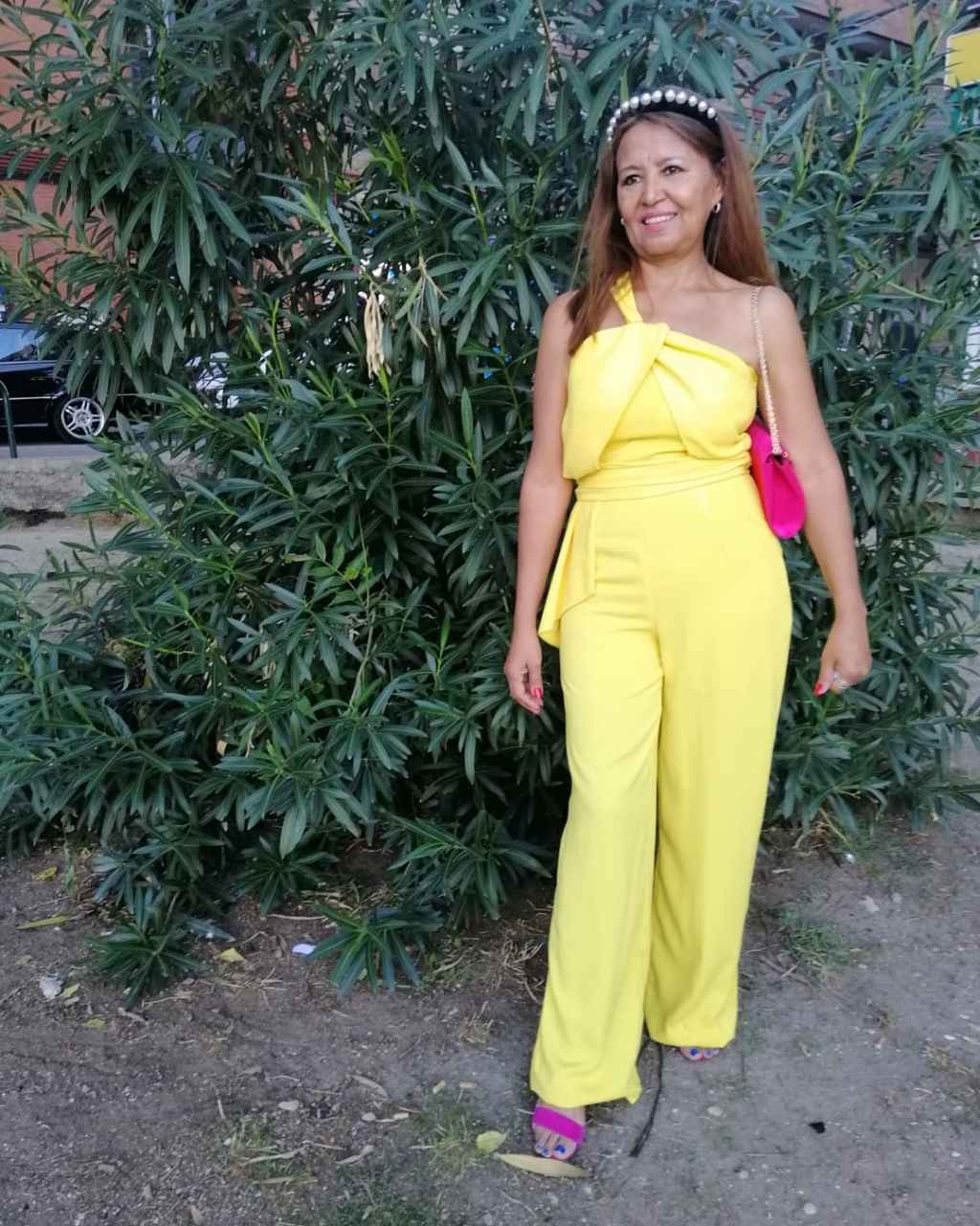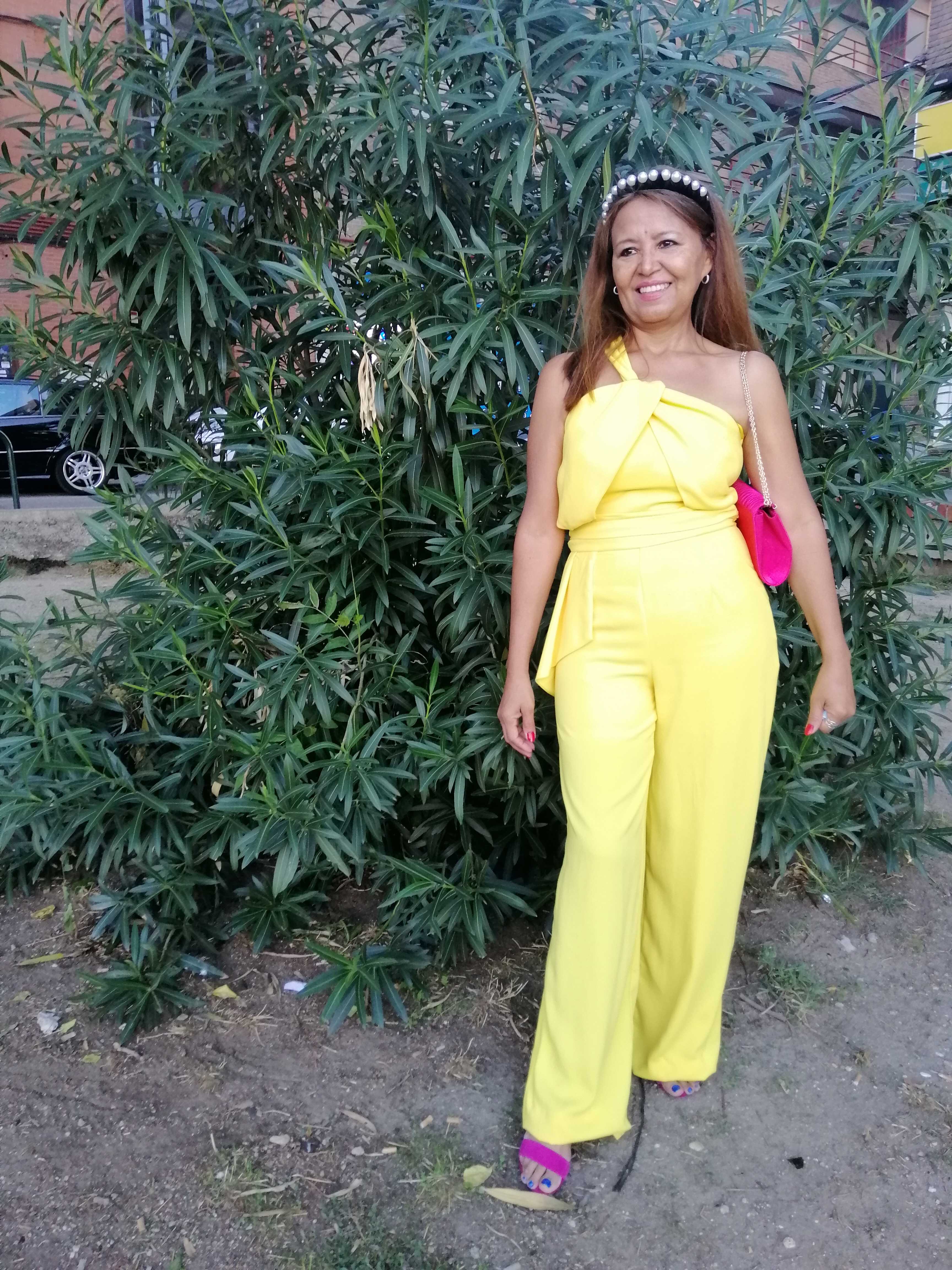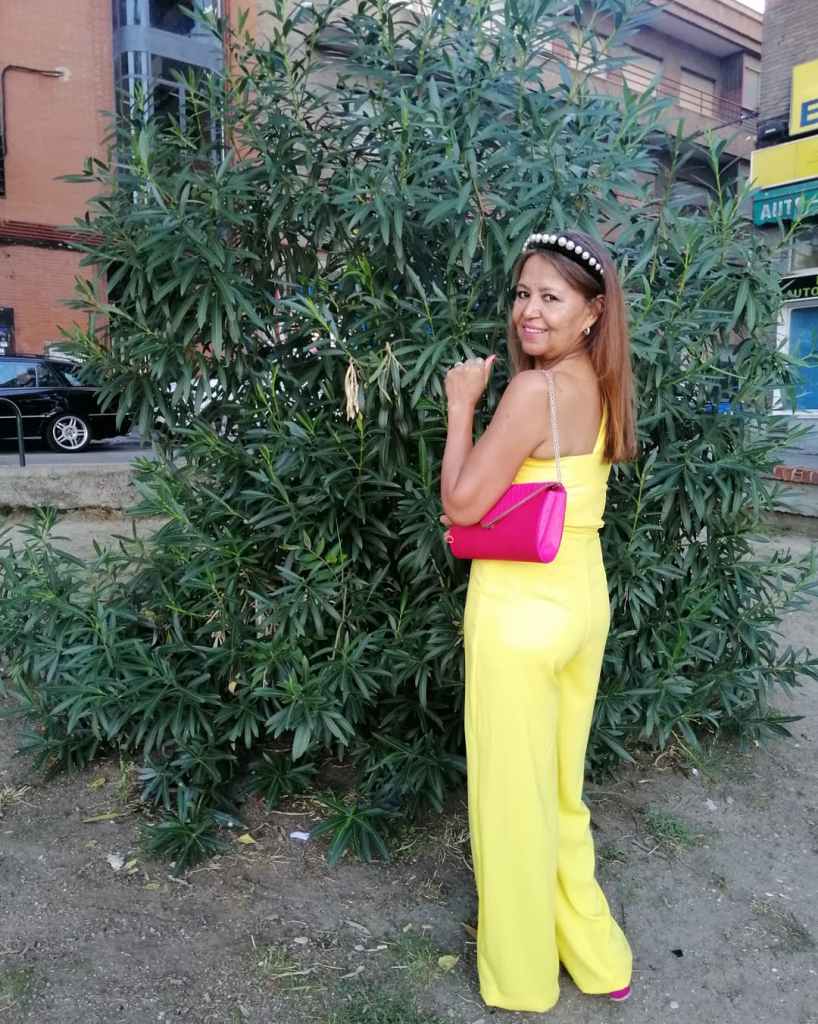 Hoy os quiero mostrar este mono largo en color amarillo, de un solo tiro diagonal, con drapeado en los pechos, cinturón del mismo mono que cae de un lado y mancando cintura, lo llevo con unas sandalias y clutch del mismo color (fucsia) y una diadema de perlas. Este look lo lleve a una comida con motivo del cumpleaño de una amiga.
