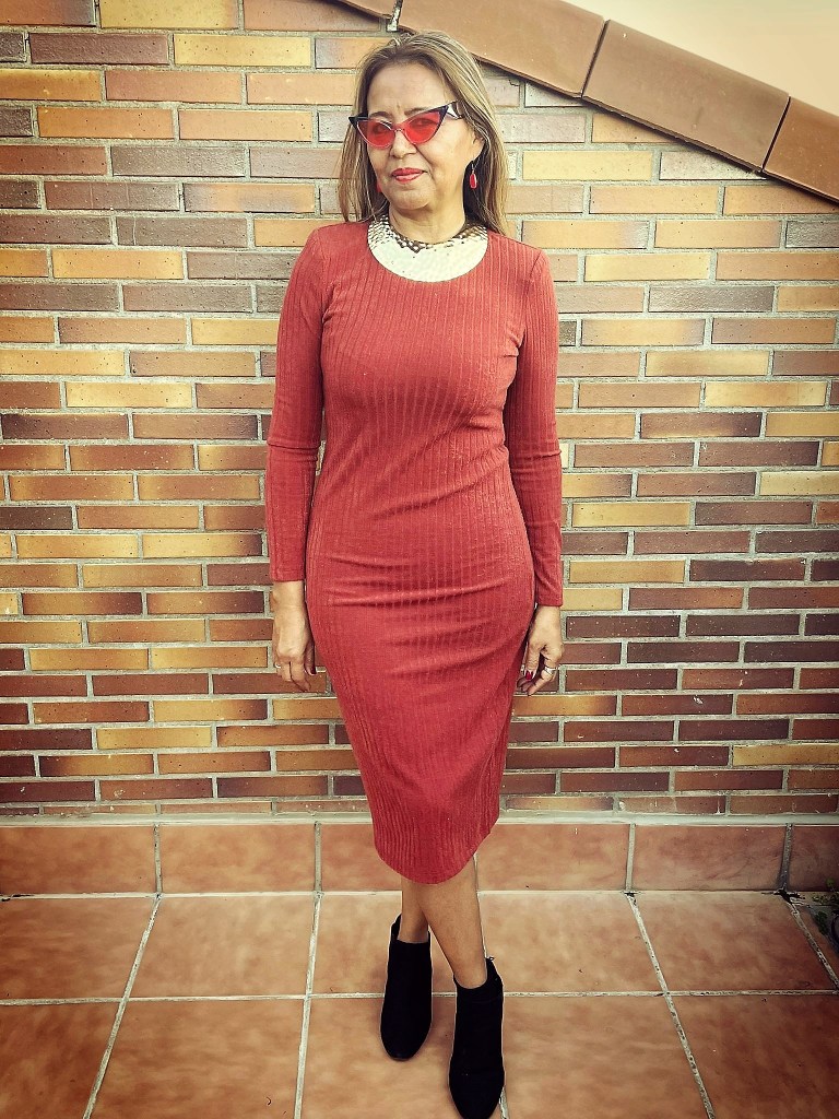 10 Look con vestido manga larga y botines: Un vestido calentito para día de menos frío, puedes completar el look con botines con un poco de tacón para un look sencillo y cómodo. No olvides los complementos para potenciar más el look.