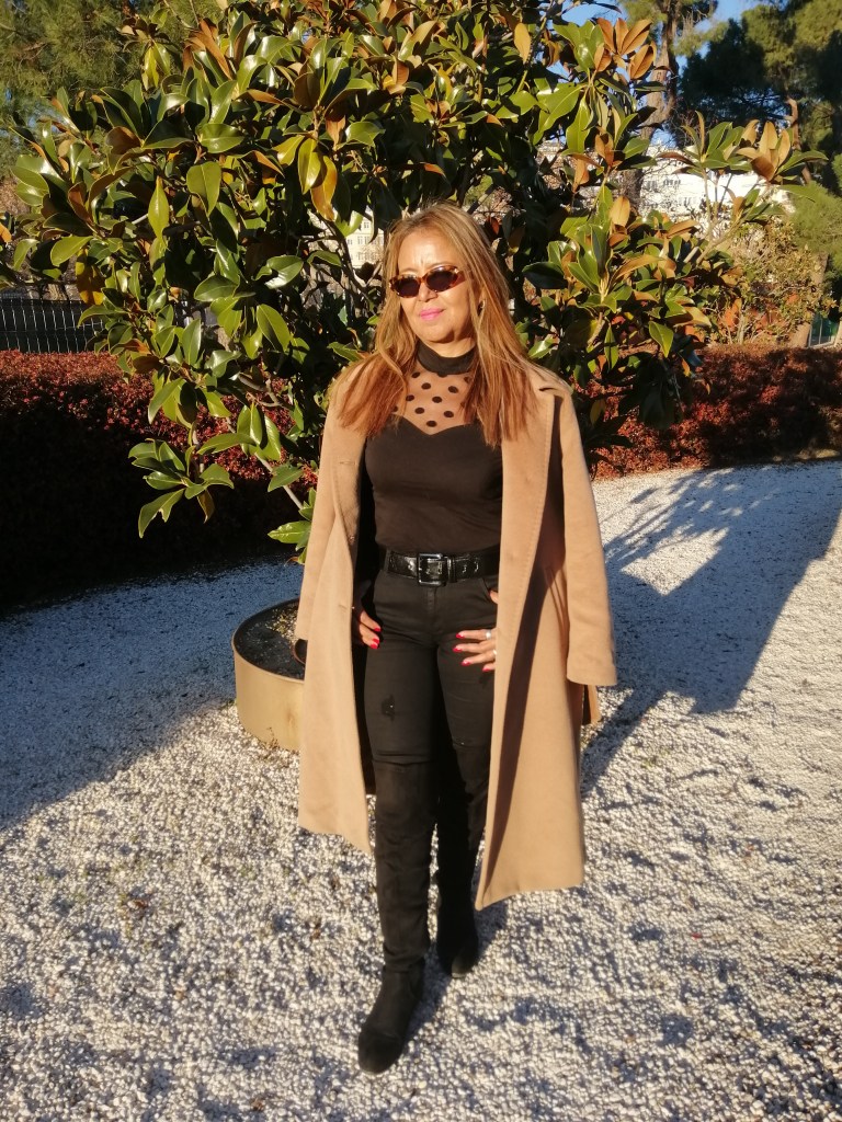 El tercer look con gabardina color camel este es uno de los colores que no pueden faltar en nuestro armario en esta temporada. ¿Porque?, porque es muy fácil de combinar y porque este color le sienta bien a todos. Con este look use un fondo negro y un toque de animal print.