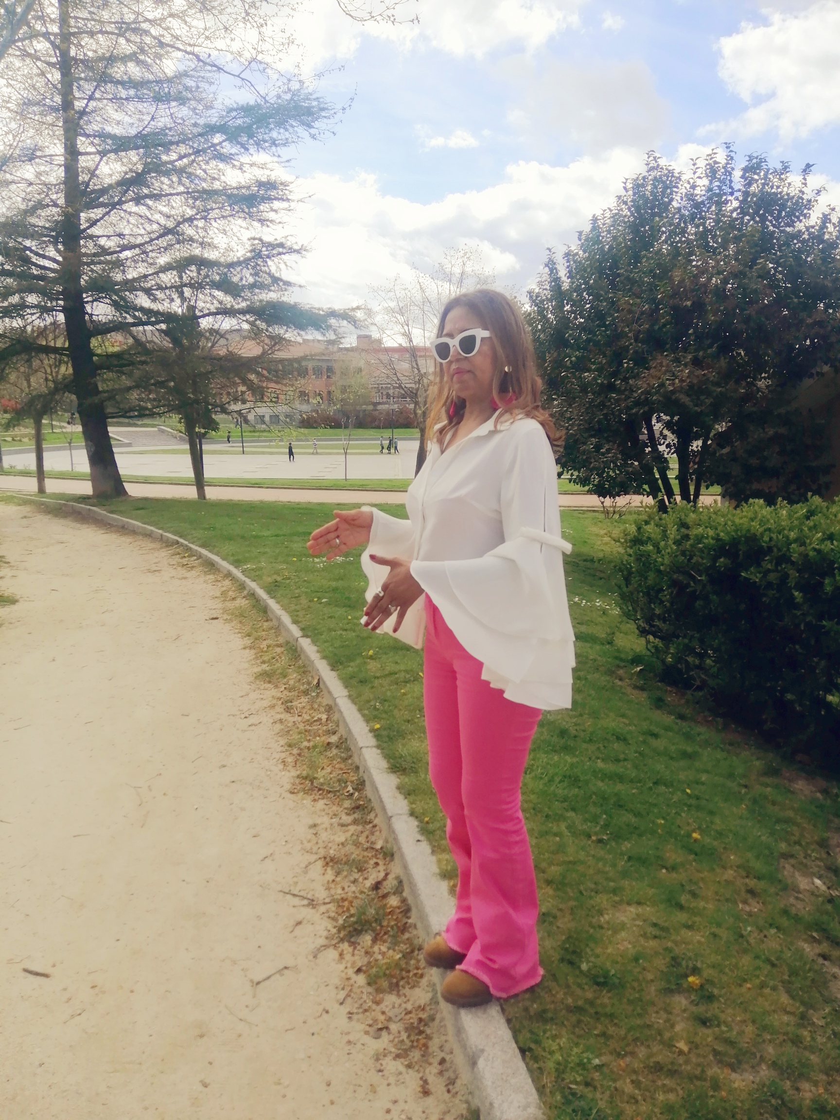 Como os mencione anteriormente el pantalón es tipo vaquero con la pernea de pata de elefante, ceñido al cuerpo, lo conjunte con una camisa blanca que adoro y que tiene mangas acampadas dobles, con abertura y un lazo al comienzo de la manga, de complemento me puse unos pendientes largo color rosa para hacer juego con el pantalón y unas gafas blanca que realzaban con la camisa; de calzado llevo unos botines en color crudo que no se dejan ver mucho porque este tipo de pantalón suelen tener el bajo hasta el suelo.
